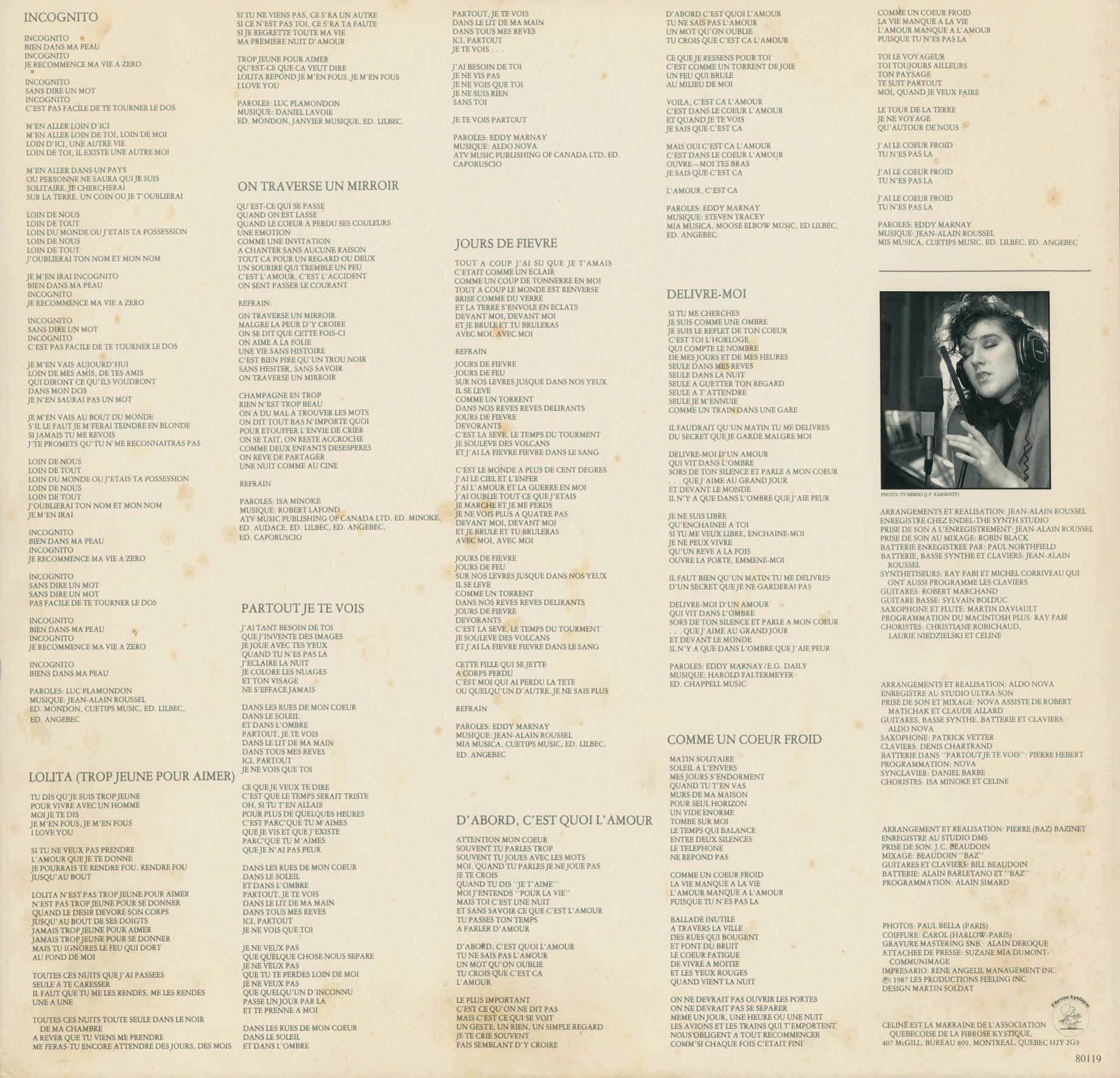 Arrangements et réalisation: Jean-Alain Roussel (A#1-2, B#1-4), Aldo Nova (A#3-4, B#2), Pierre Bazinet (B#3)